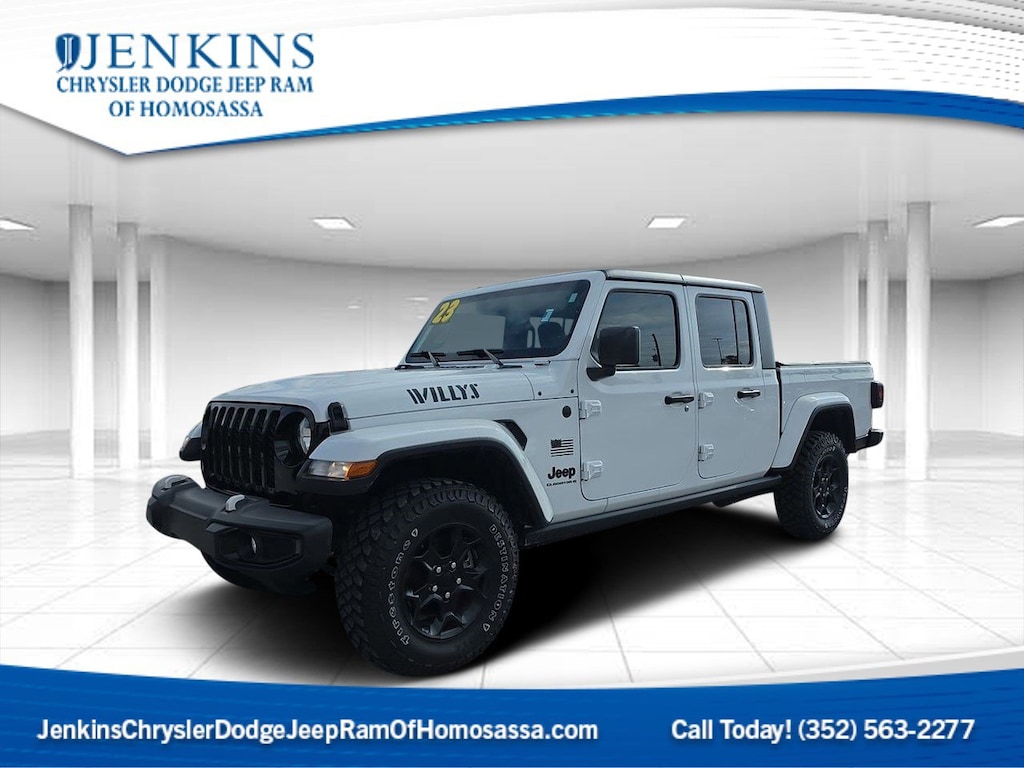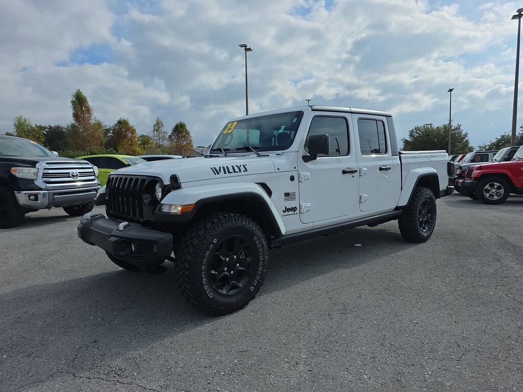 DECEMBER SAVINGS, END OF YEAR DEALS, GET THEM BEFORE THEY ARE GONE! The price does not include tax, tag, license, an electronic filing fee of $449.00**, a private tag agency fee of $199.00**, and a predelivery service charge of $1199.00** **This charge represents costs and profit to the dealer for items such as inspecting, cleaning, and adjusting vehicles, as well as preparing documents related to the sale. * EPA-estimate metric: these are contingent on ideal conditions within a lab. Real-world situations such as carrying passengers or cargo, using climate control, driving style, and ambient temperatures can affect actual metrics. 17/22 City/Highway MPG CARFAX One-Owner. Clean CARFAX. Certified. Bright White Clearcoat 2023 Jeep Gladiator Willys 4WD 8-Speed Automatic 3.6L V6 24V VVT
